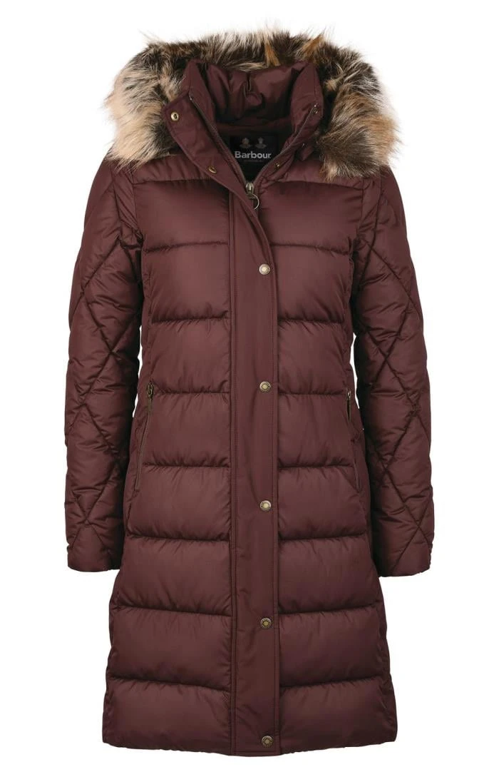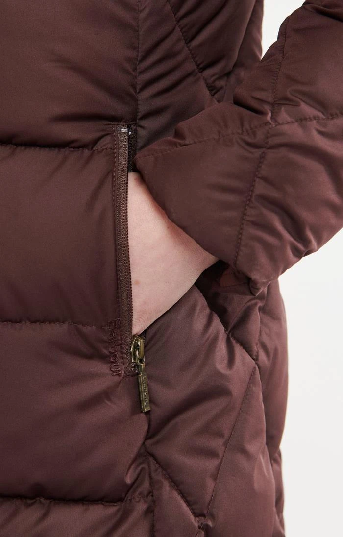 The stylish solution to staying warm this winter, the Barbour Daffodil quilted jacket has a whole bunch of outstanding features on display. The different shaped padded baffles create a flattering line bringing this cold weather classic blossoming into contemporary life. Thereโs an extra-insulating zip and stud fastening and a cosy detachable hood with a luxurious faux fur trim. Created in a longer line for maximum cosiness where and when you need it most, the unmistakable mark of Barbour is carried throughout, from the branded zip tags and buttons to the discreet embroidered logo to the lower left pocket.