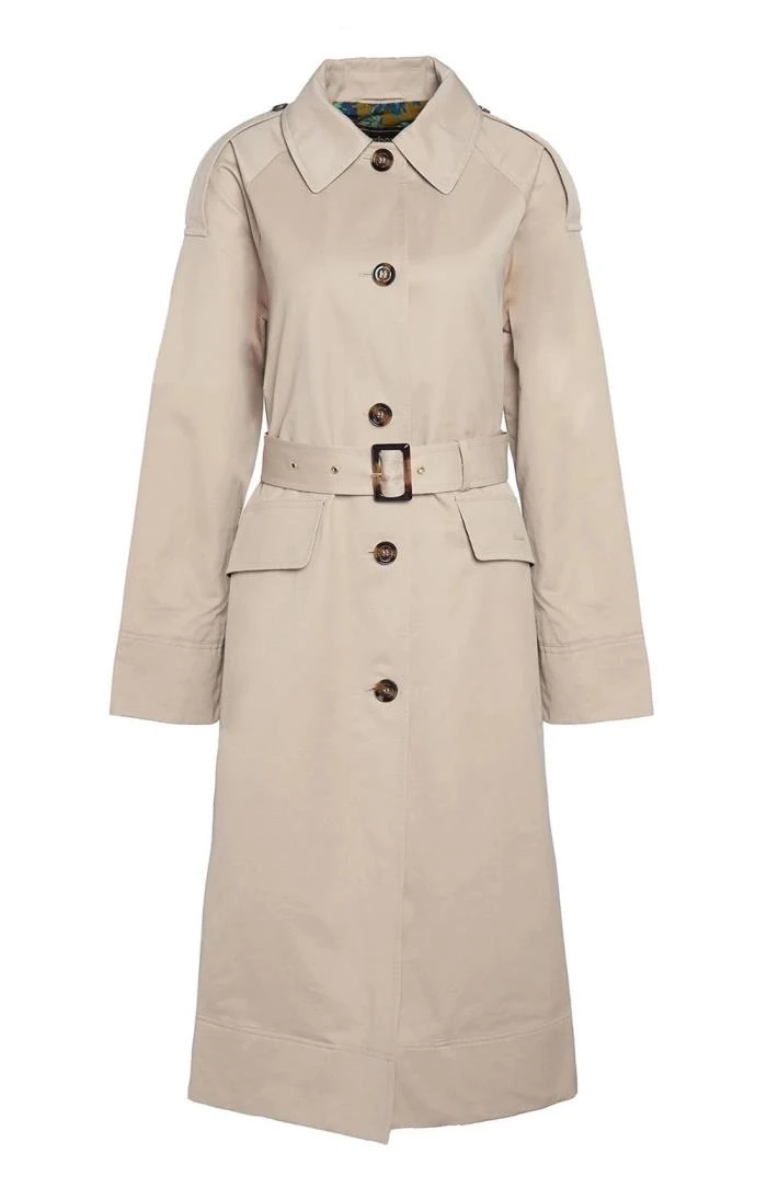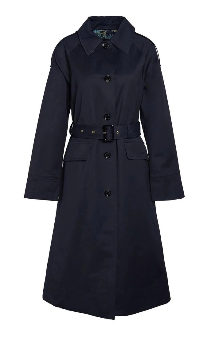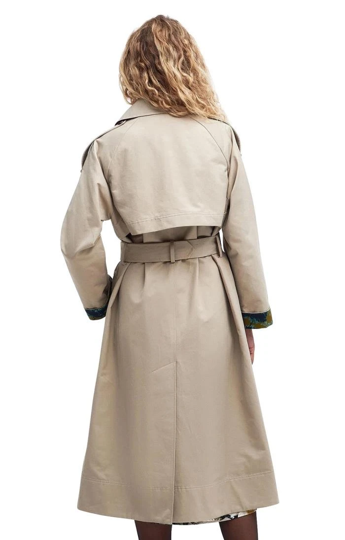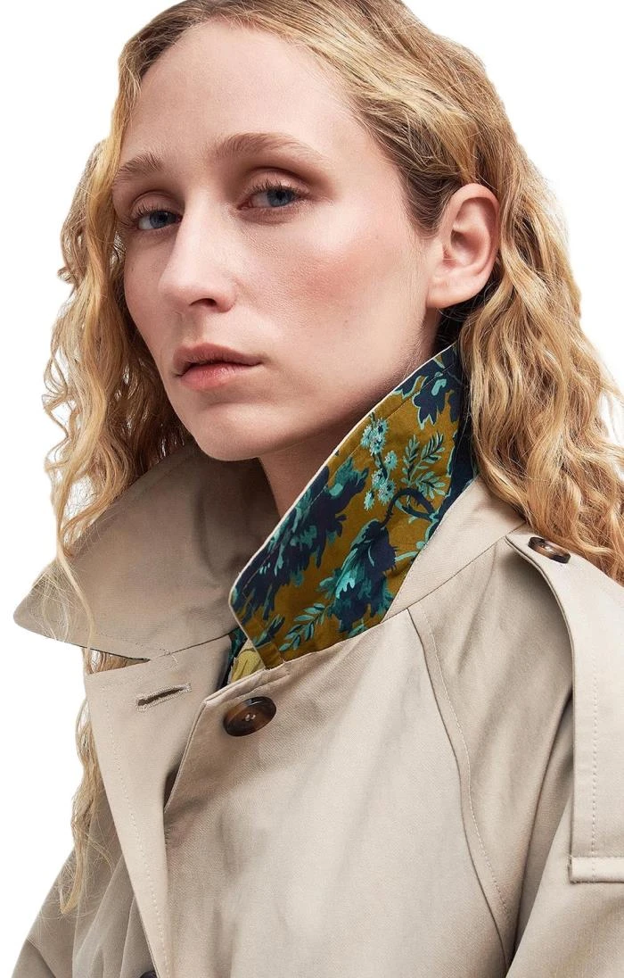 This remarkable ladies Barbour Queensbridge showerproof trench coat is an exciting combination of a bold print coupled with timeless design. With its long A-line shape giving you a flattering silhouette, a vibrant pattern inspired by beautiful British nature and its use of premium cotton for a breathable finish, you won’t want to wait until it’s raining to don this attractive weather-resistant layer!