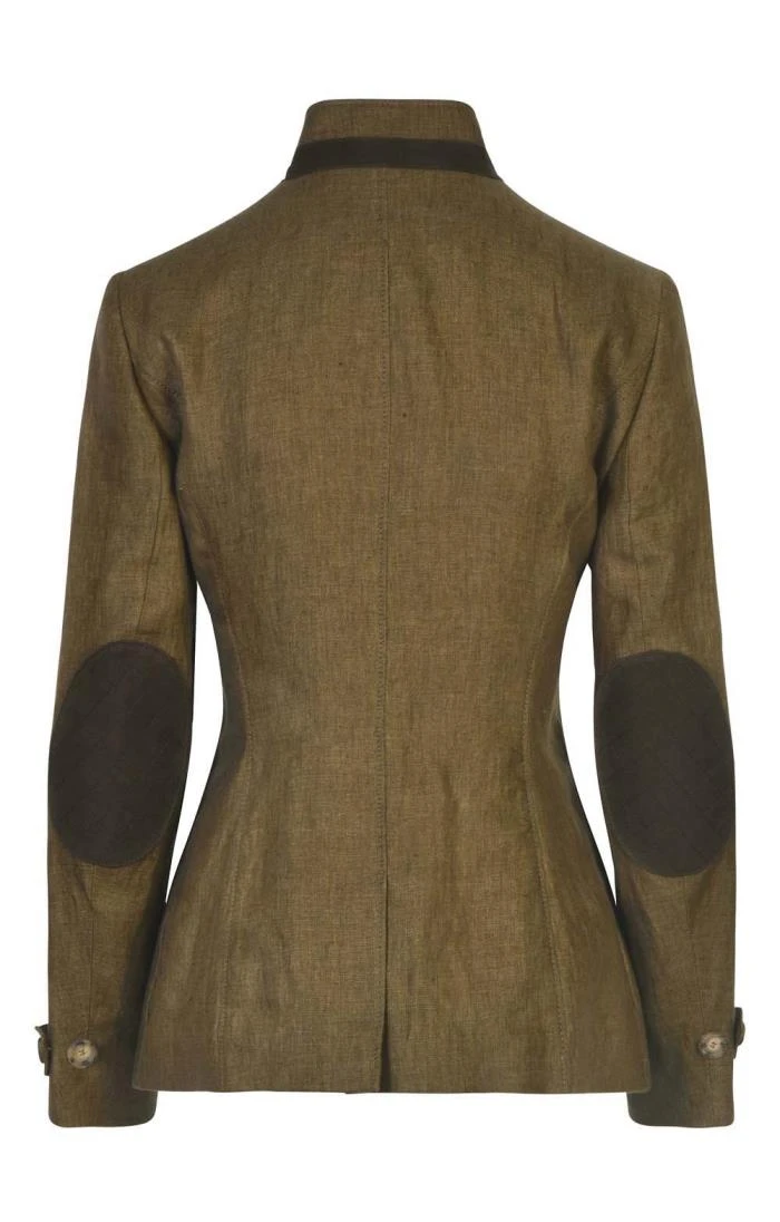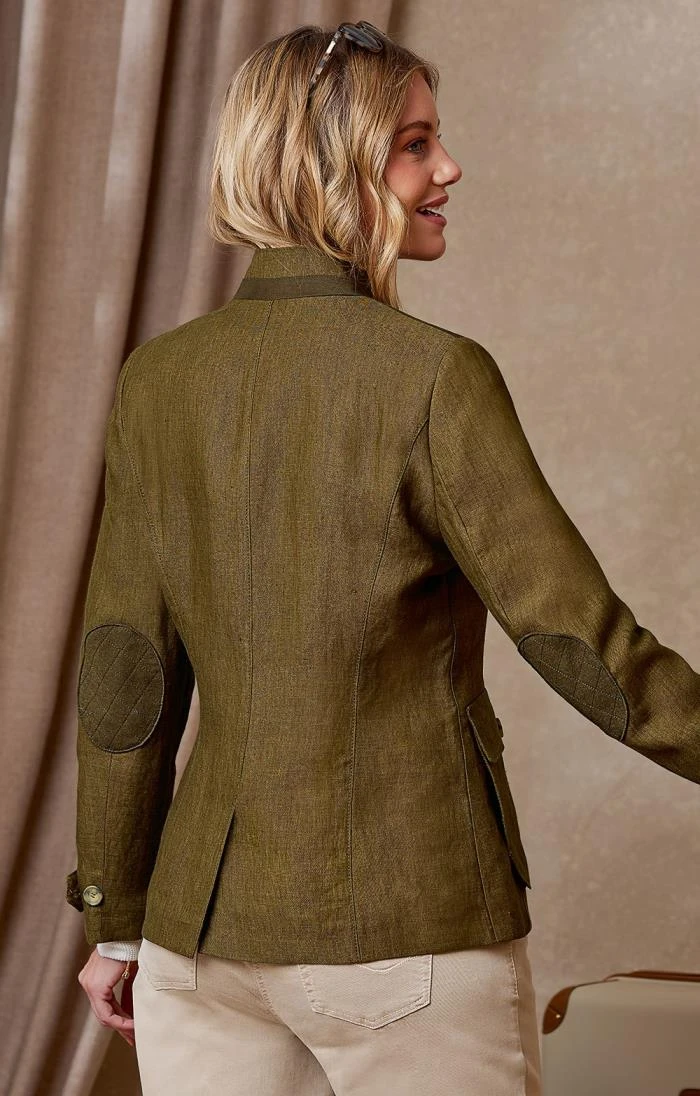 Beautifully crafted in crisp and cooling linen, this patch safari jacket is exclusive to The House of Bruar. Its neat, elegant lines sweep down from a stand collar while two front bellows pockets and a slanted chest pocket lend it a sense of classic country style. A single quilted shoulder patch gives it a striking asymmetric flair while mock-horn buttons add the perfect finishing touch.