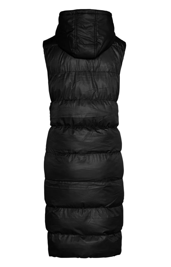 Choose cosiness, comfort and contemporary styling in the long Sharna gilet with its stacks of deeply padded baffles and slimline sleeveless silhouette. Fastening with a combined zip and button closure and enhanced with stud-fastened angled hand pockets and a snug hood, this is a compelling edition of a core mid-season cover-up that is fast becoming a forever wardrobe favourite.