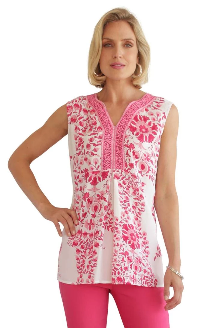 Inspired by eons of tradition and skill, this ladies Wedgewood vest boasts a flattering sleeveless silhouette adorned with a fabulous print. The dramatic neckline with its V-neck cut and bold edged artwork helps elongate this hip length top to create a very complimentary look. We love the striking box pleat to the front and the gentle flare at the hem.