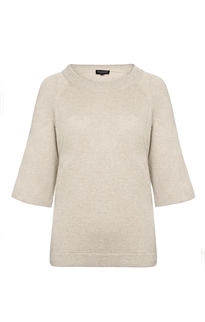 An adaptable addition to your all-season selection, layer this cotton and wool blend short sleeve crew over fine knits or silk blouses for an elegant winter aesthetic that offers warmth and comfort without compromising on style. The deep ribbed neckline creates a flattering line worn solo or as a slipover, while the smooth hem can be left loose or tucked in to slip skirts or straight-legged denims for cool contemporary chic.