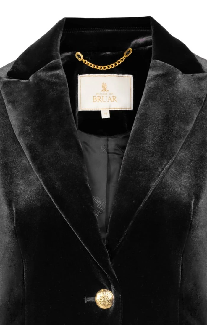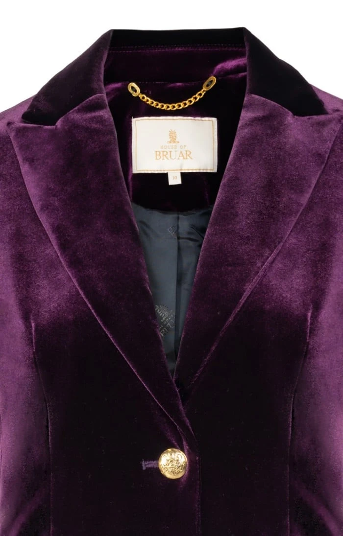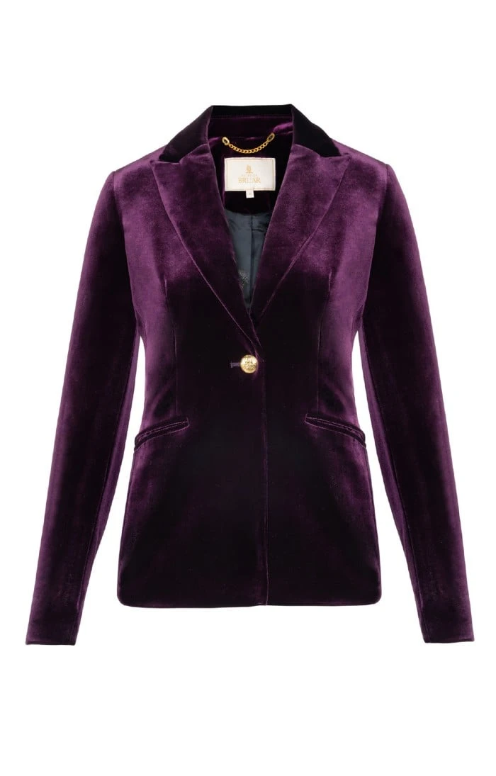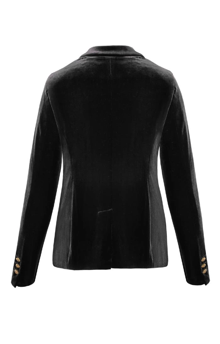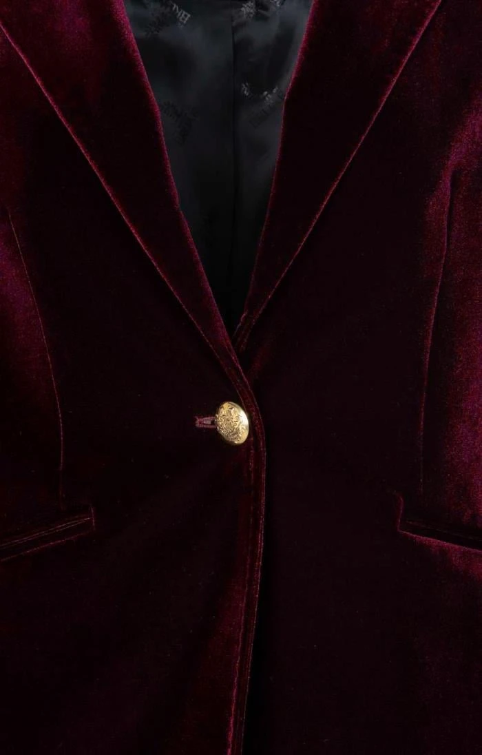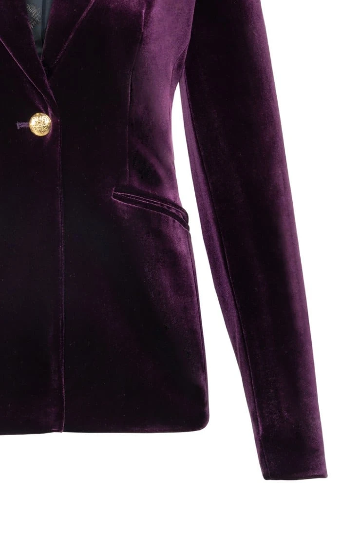 Nothing speaks of sheer sophistication like our new season velvet, and this elegant single breasted blazer captures its easy drape and scintillating depth of colour perfectly. It features a single gold embossed button front closure, three button cuffs and jetted side pockets. Fully lined with inside pocket.